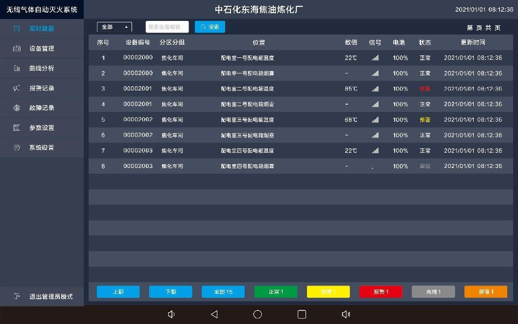 点击实时数据界面如下图所示,展示每个传感器安装位置,实时温度、烟雾浓度、报警状态、以及数据更新时间等。