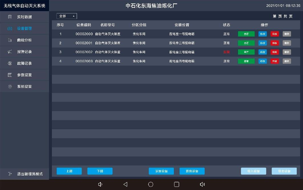 点击设备管理,出现以下界面,界面显示每个传感器的明细信息包括安装位置、报警阈值、通讯地址等可对每个传感器参数进行修改设置。3.3、曲线分析