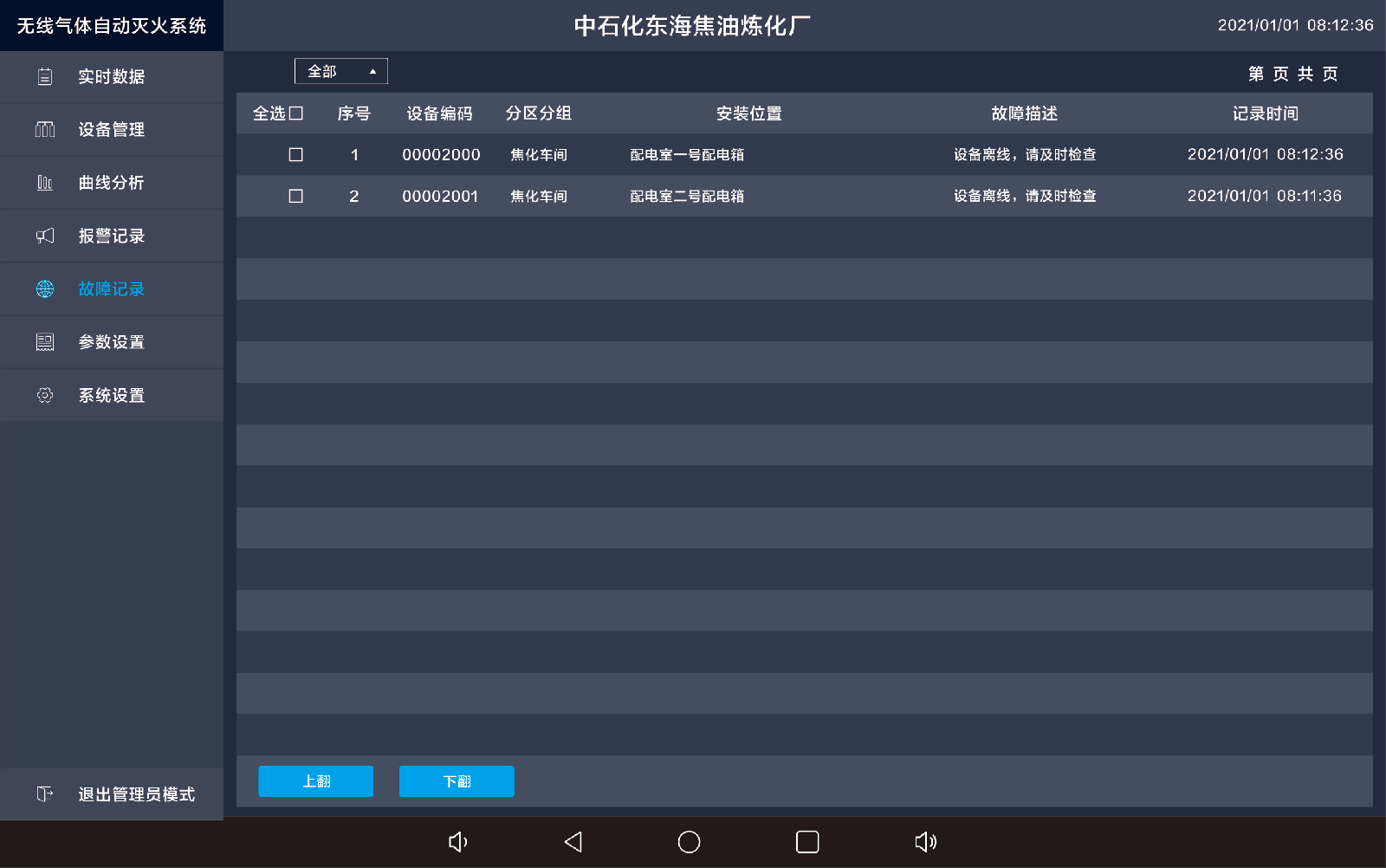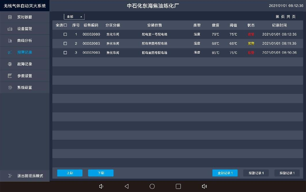 点击报警记录,出现以下界面,显示具体的传感器报警位置与报警状态值以及报警的时间等信息。3.5、故障记录