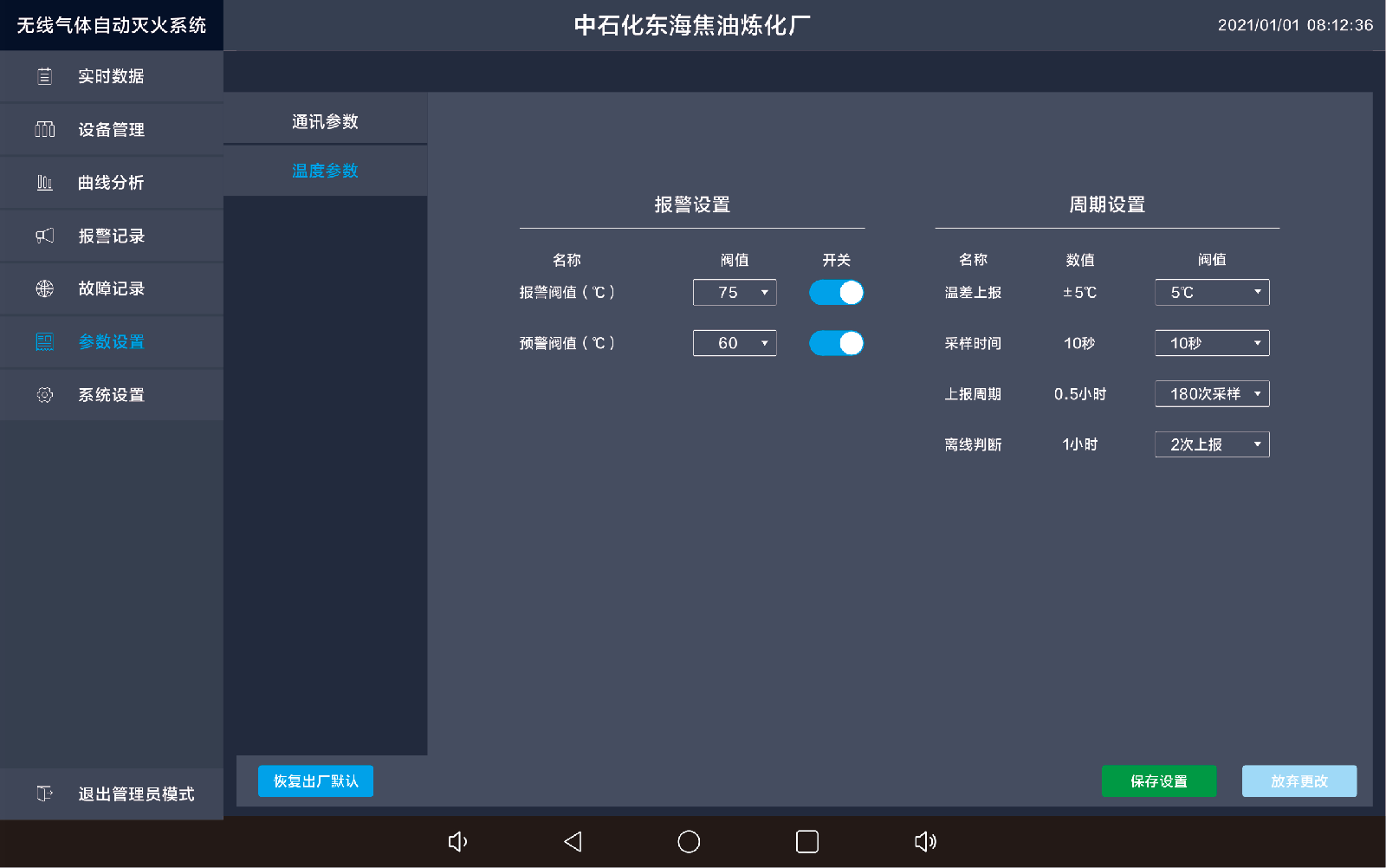 点击参数设置,出现一下界面,可对传感器与主机之间的通讯参数以及传感器报警条件等参数设置。